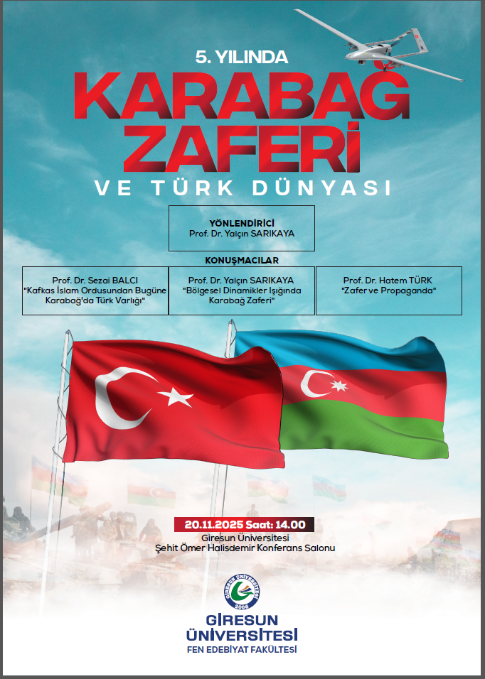 Fakültemiz Türk Dili ve Edebiyatı Bölümü Başkanlığı tarafından, 20 Kasım 2025 Perşembe günü 14.00-15.00 saatleri arasında Şehit Ömer HALİSDEMİR Konferans Salonu'nda, Fakültemiz Dekanı Prof. Dr. Beyhan KESİK'in moderatörlüğünü yapacağı, Prof. Dr. Hatem TÜRK'ün "Zafer ve Propaganda", Prof. Dr. Sezai BALCI'nın, " Kafkas İslam Ordusundan Bugüne Karabağ'da Türk Varlığı", Prof. Dr. Yalçın SARIKAYA'nın "Bölgesel Dinamikler Işığında Karabağ Zaferi" başlıklı anlatımlarıyla; konuşmacı olarak katılacakları "5. Yılında Karabağ Zaferi ve Türk Dünyası" temalı panel düzenlenecektir.