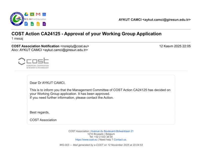 COST Aksiyonu kapsamında gönderilen resmî onay yazısı ve sistem kayıt çıktıları ilgili makamlara iletilmiştir.